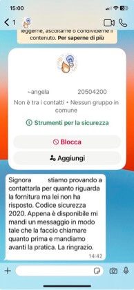 La procedura include quindi un messaggio WhatsApp inviato da un profilo accompagnato da un nome e un logo, elementi che a loro volta infondono fiducia.