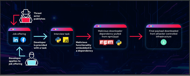 Il cuore dell’operazione risiederebbe quindi nei repository associati alle false aziende, il cui elemento critico sarebbe rappresentato dalle dipendenze dichiarate nei file di configurazione, che punterebbero a pacchetti npm e PyPI controllati dagli attaccanti.