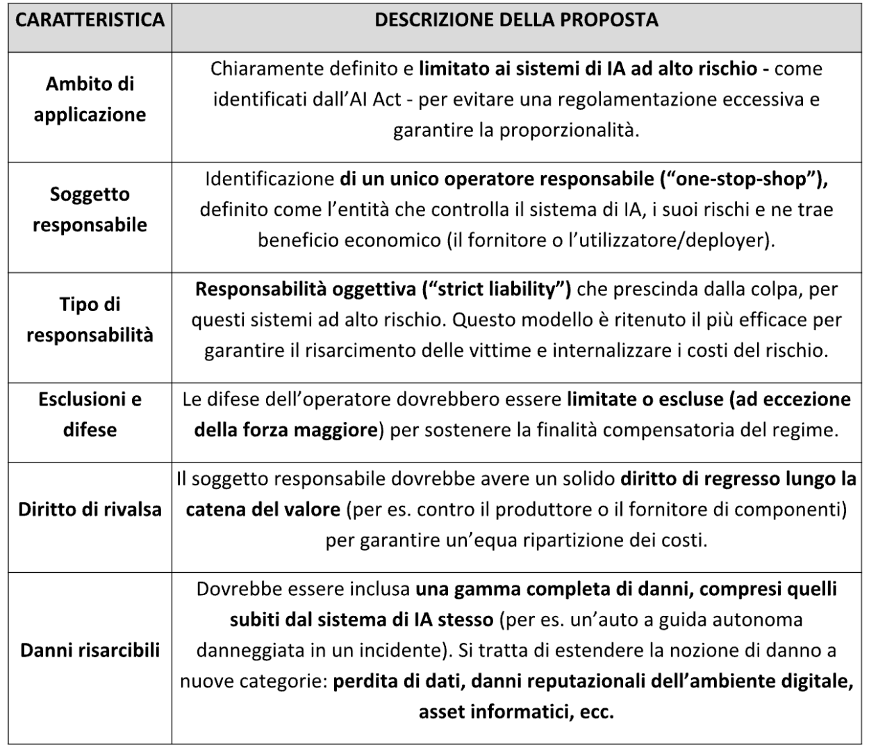 Questa soluzione – basata come detto sulla pregressa proposta RLAI del 2020 – avrebbe il pregio di stabilire ex ante precisamente chi è responsabile (l’operatore) e a quali condizioni (a prescindere dalla colpa), offrendo anche alle imprese un quadro chiaro per la gestione del rischio e la stipula di polizze assicurative.