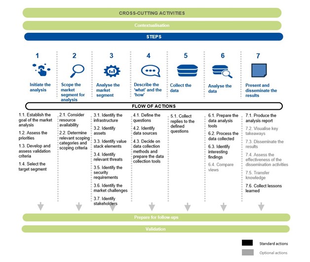 Ma non è tutto. Il quadro in parola comprende sette step volti a guidare gli analisti nell’esecuzione di un’analisi del mercato della cyber security: