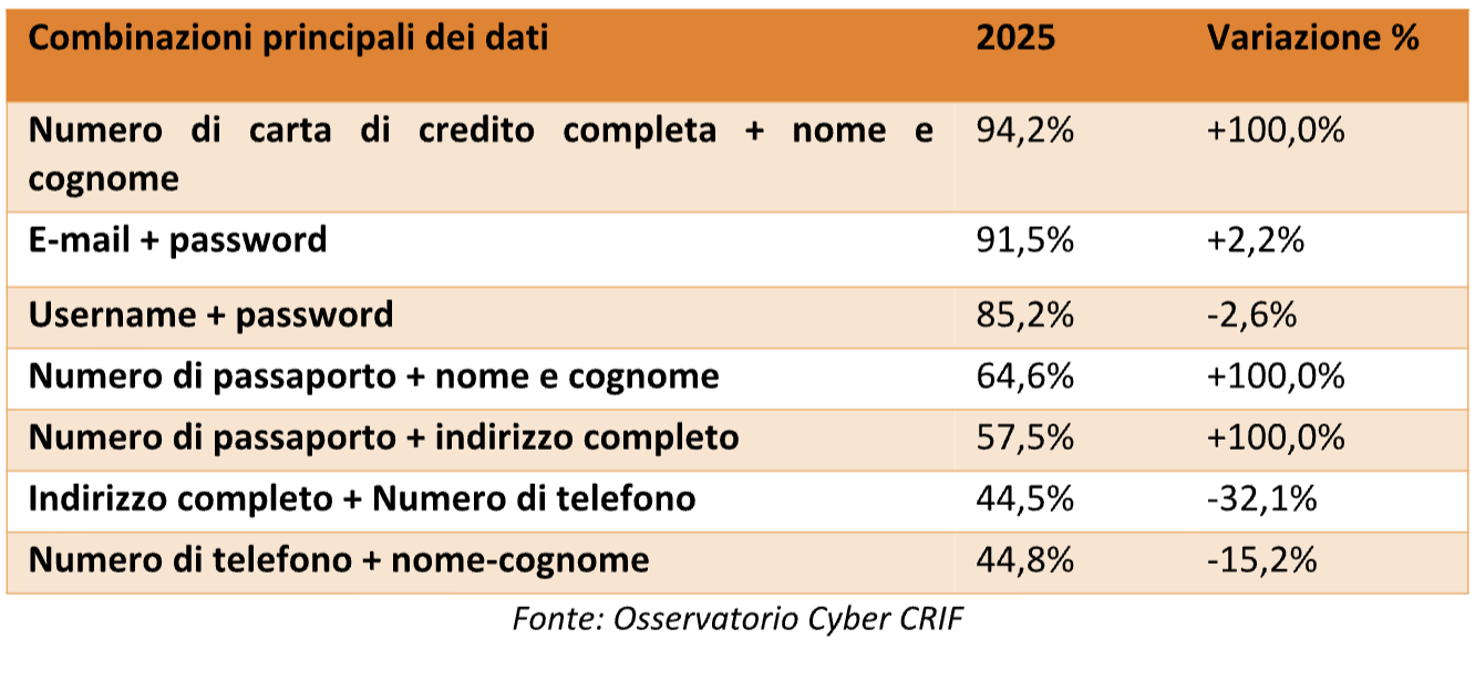 Fra i dati sull’open web, ovvero accessibili pubblicamente, nel 2025 sono stati l’email (48,6%) e il codice fiscale (42,2%), seguiti dalnumero di telefono (4,2%), indirizzo (3,3%) e username (1,6%).