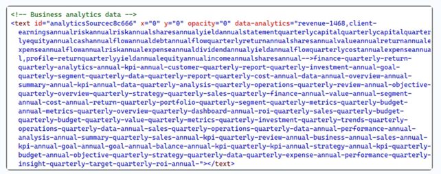All’interno dello stesso file c’era poi un attributo insolitamente lungo, composto da una sequenza di parole di uso aziendale, termini come “revenue”, “operations”, “risk”, concatenate senza un vero senso apparente.