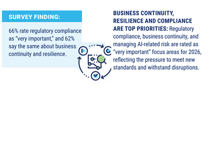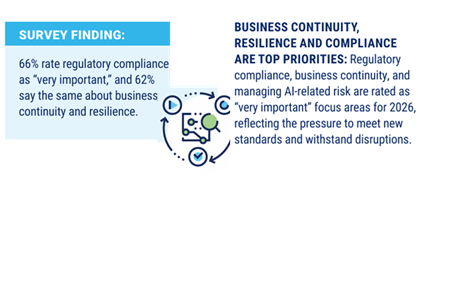 Secondo gli intervistati, le organizzazioni, per far fronte a questo scenario di minacce, dovranno maggiormente focalizzarsi sulla conformità normativa (66%) e sulla continuità e resilienza aziendale (62%).